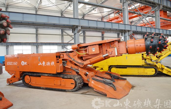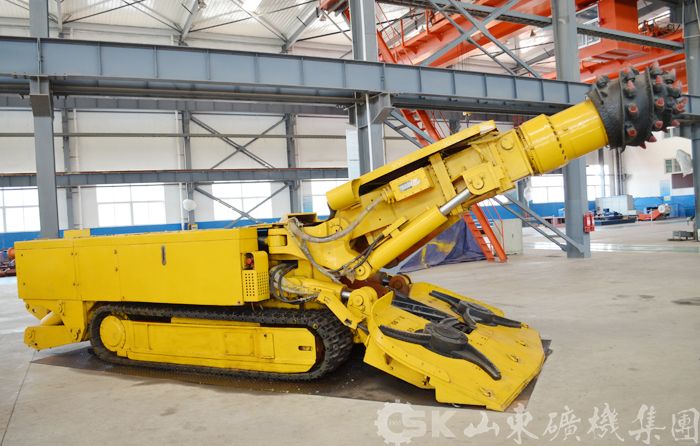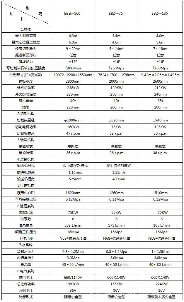 我公司研制開(kāi)發(fā)了懸臂式掘進(jìn)機(jī),具有結(jié)構(gòu)緊湊、外形低矮、適應(yīng)性強(qiáng)、工作穩(wěn)定、操作簡(jiǎn)便等特點(diǎn)。該機(jī)裝運(yùn)系統(tǒng),采用高強(qiáng)度雙排鏈,運(yùn)載能力強(qiáng),事故率低,鏟板抬起時(shí)鏟板與過(guò)渡槽之間無(wú)負(fù)角,不產(chǎn)生飄鏈現(xiàn)象,裝巖石時(shí)可以去掉壓鏈塊減少卡鏈?zhǔn)鹿省R簤合到y(tǒng)為集成塊式,減少了膠管和接頭的數(shù)量,方便維修和拆裝,管路事故率低,并且可以流量合成,形成行走雙速;具有功率、電機(jī)溫度、水壓、油壓、漏電等保護(hù);自動(dòng)有級(jí)調(diào)整切割擺動(dòng)速度,采用星輪連續(xù)裝載,PLC控制,全中文狀態(tài)顯示,多組故障記憶。現(xiàn)已開(kāi)發(fā)、生產(chǎn)EBZ75、EBZ135、EBZ160等系列懸臂式掘進(jìn)機(jī)。適合在有瓦斯、煤塵或其他爆炸性混合氣體的巷道中作業(yè),也適用于其他工程巷道中作業(yè),可在坡度不大于±16度的煤及半煤巖巷道中工作。可以切割普氏系數(shù)f≤8的煤或半煤巖。